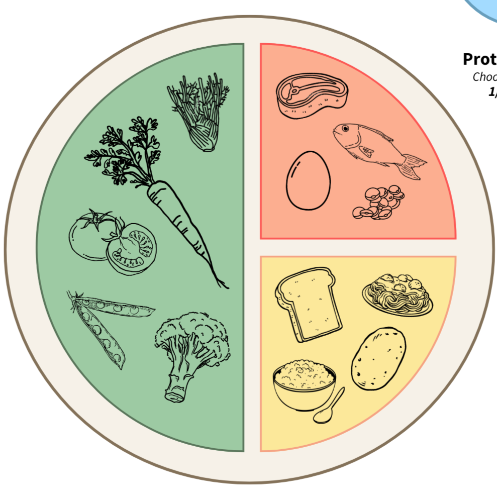 ¼ plate: Carbohydrates (rice, potatoes, pasta, quinoa, beans, whole grains, starchy vegetables)